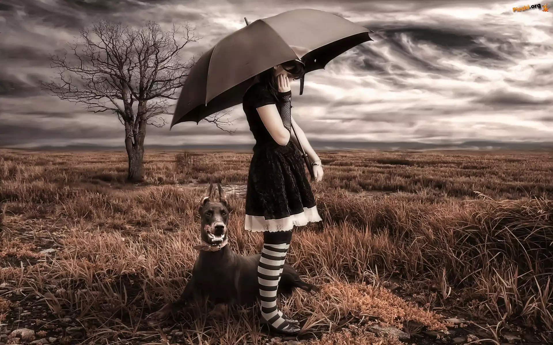 Parasol, Łąka, Pies, Drzewo, Chmury, Dziewczyna, Doberman