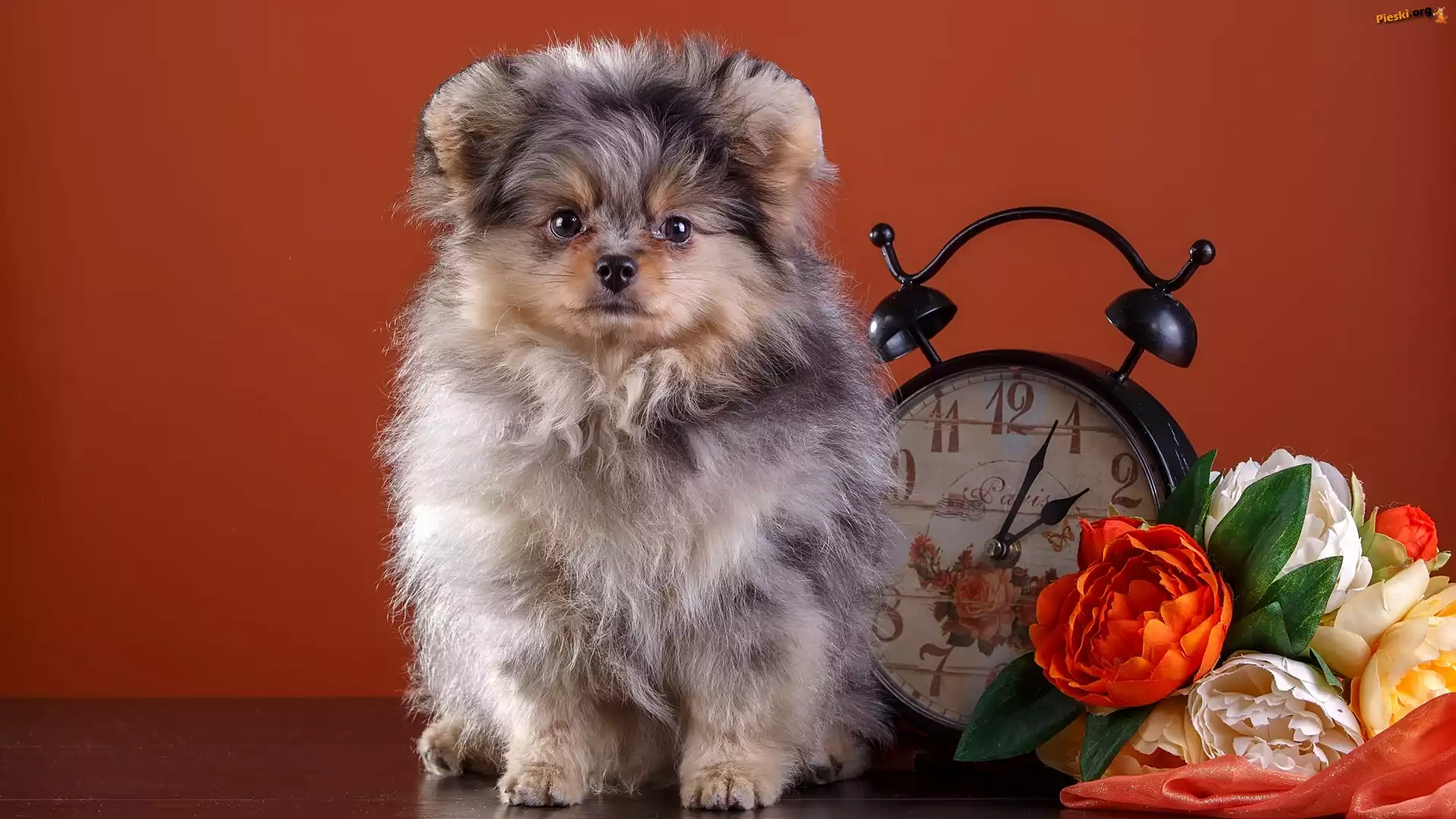 Budzik, Szpic miniaturowy, Szczeniak, Kwiaty, Pieski