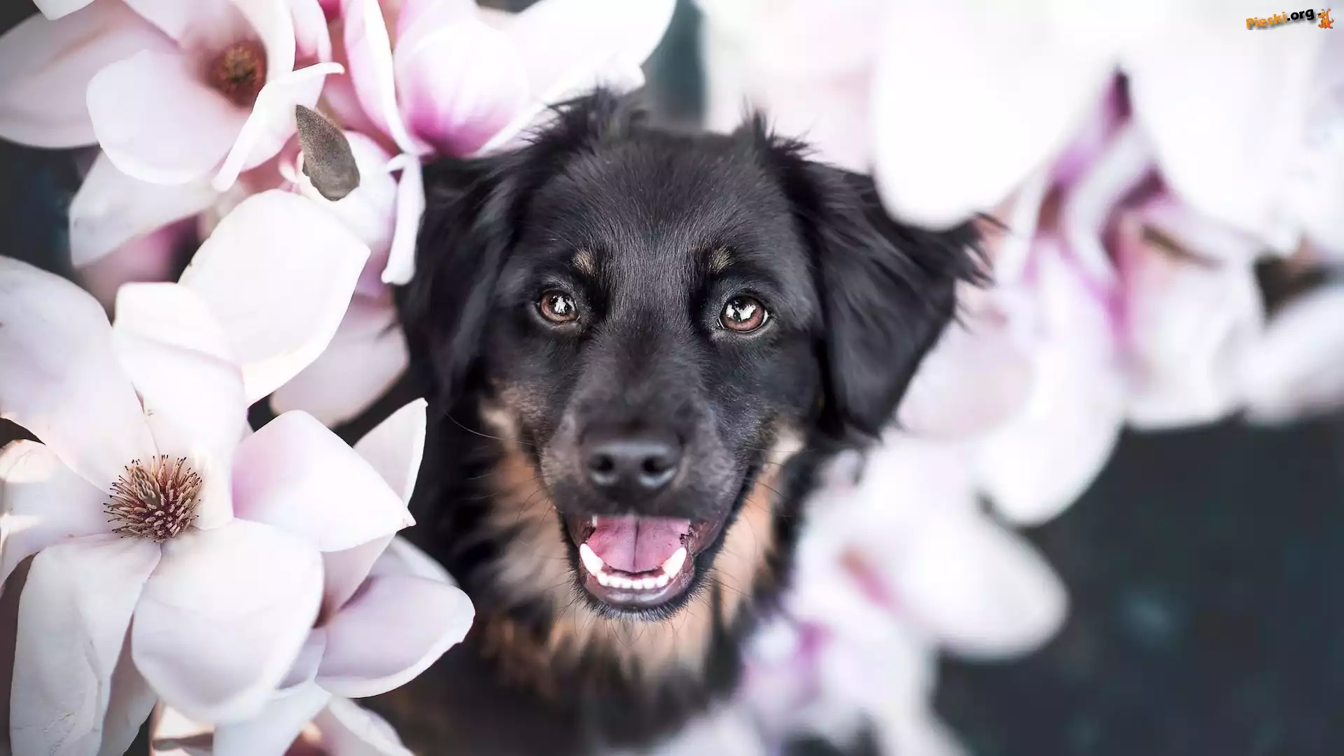 Magnolie, Kwiaty, Pies, Czarny, Pieski