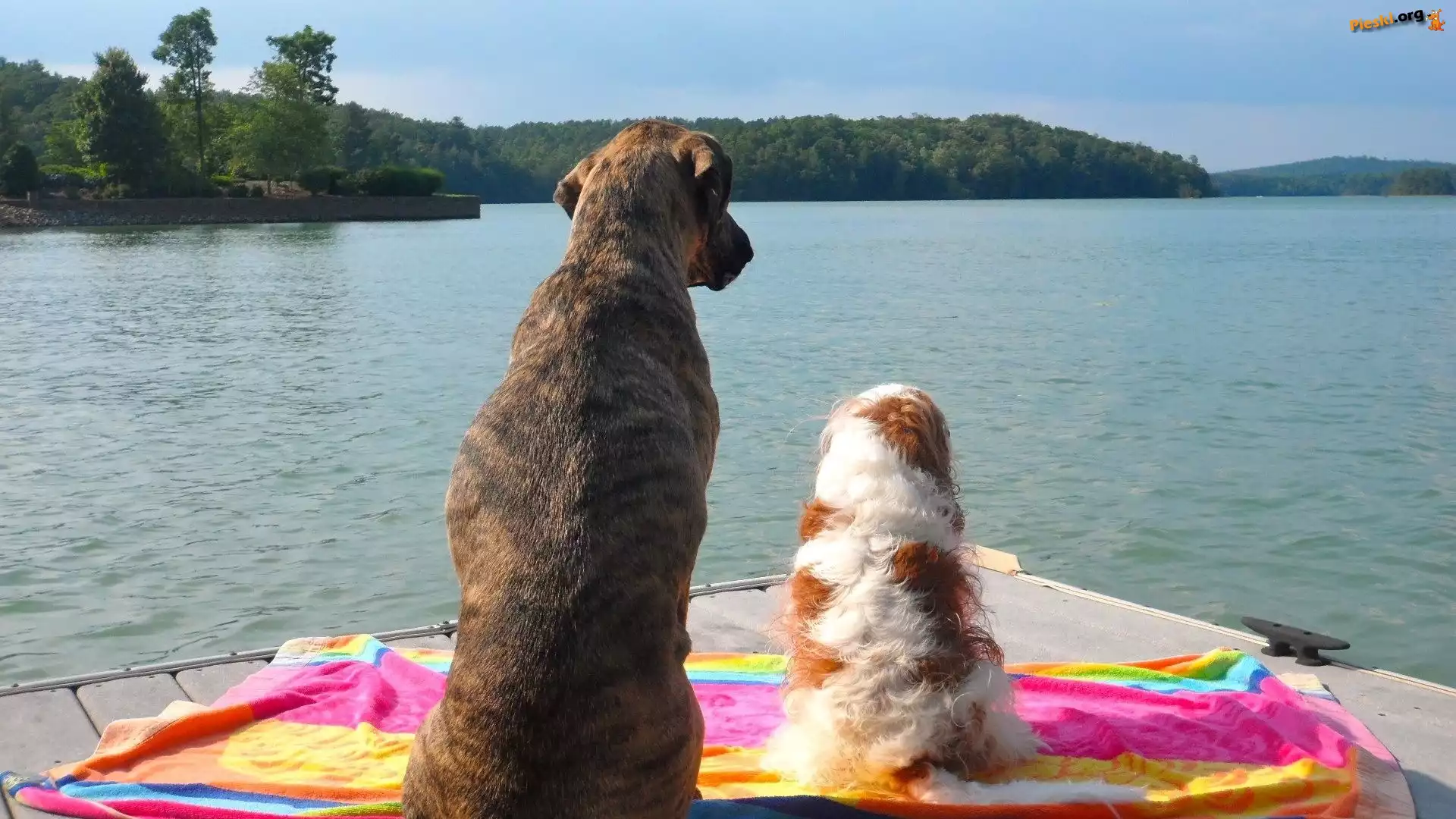 Drzewa, Psy, Dwa, Jezioro, Ręcznik, Pieski