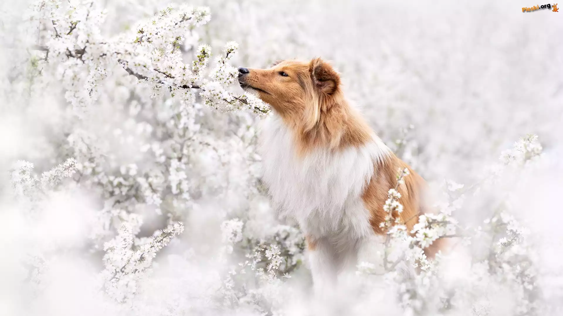 Gałązki, Kwiaty, Pies, Drzewo owocowe, Owczarek szetlandzki, Pieski