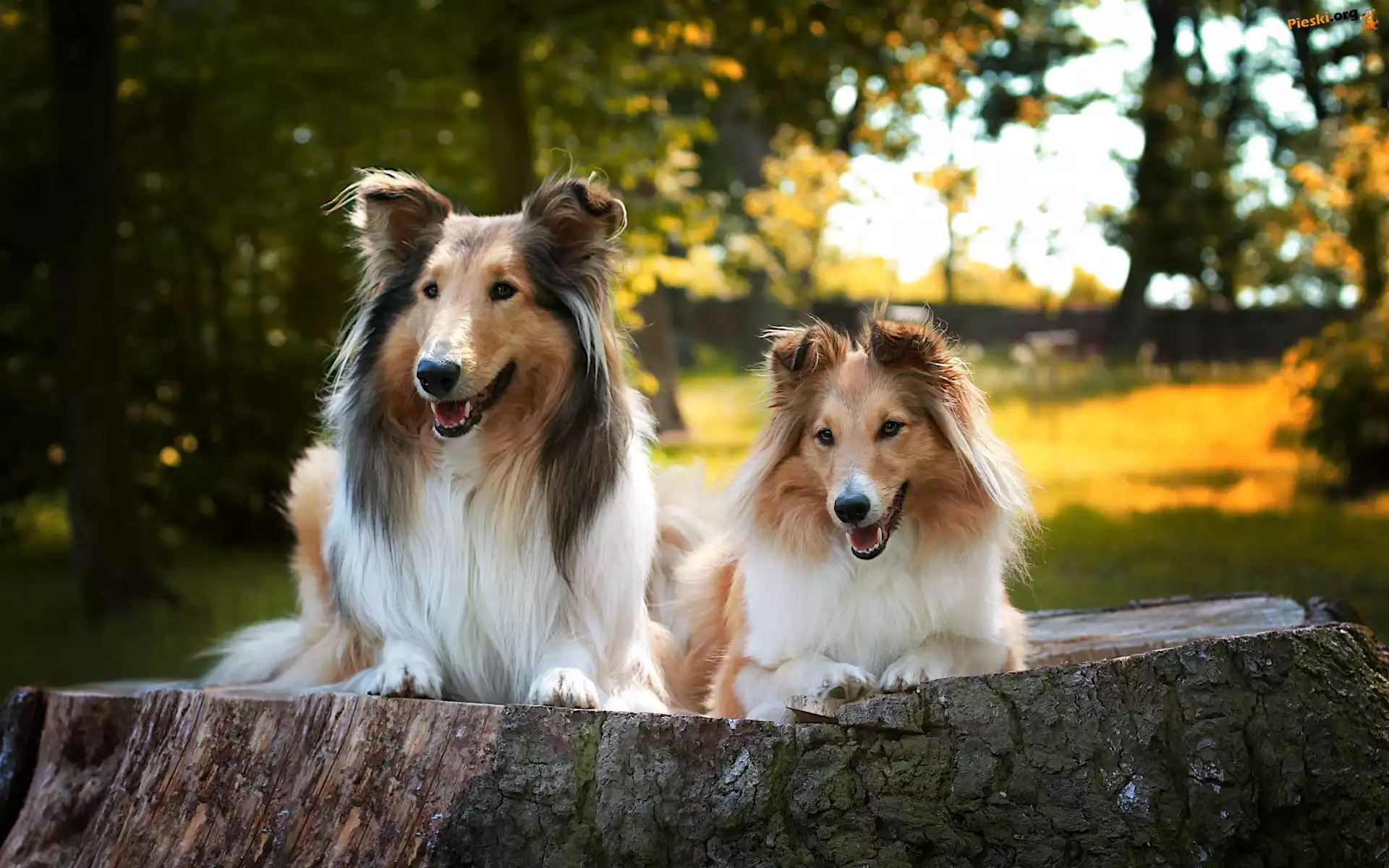 Owczarki szkockie długowłose, Park, Pień, Drzewa, Psy, Dwa