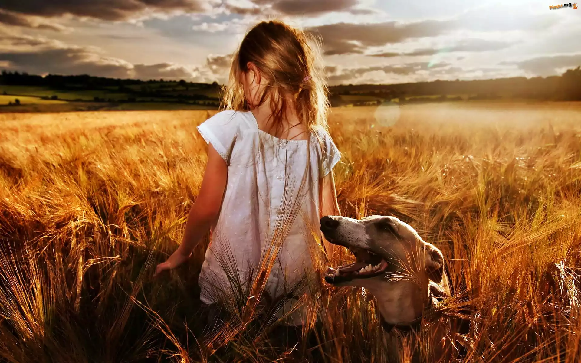 Dziewczynka, Zachód, Chmury, Chart, Pole, Słońca, Pieski