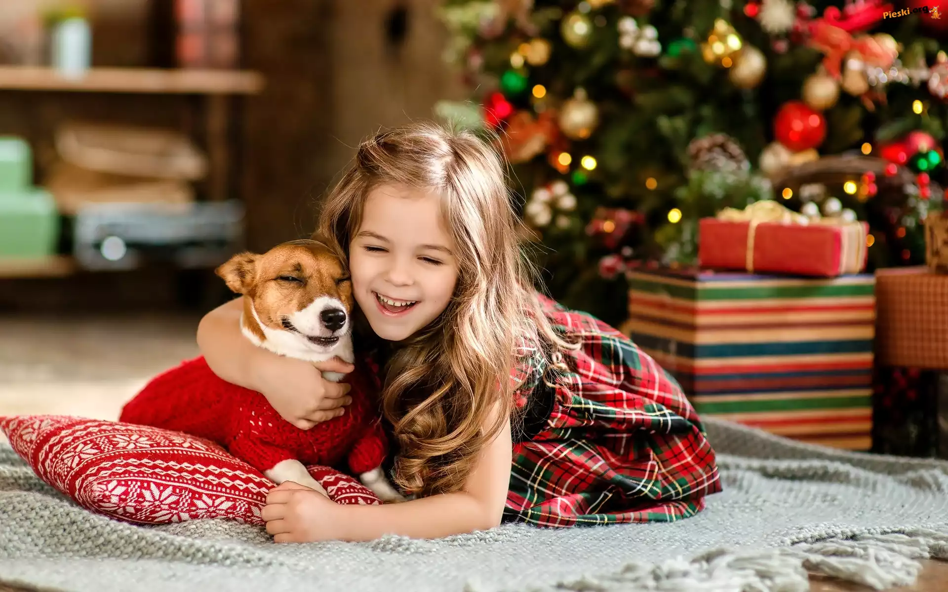 Radość, Dziewczynka, Choinka, Pies, Dziecko, Przyjaźń, Świąteczne, Pieski