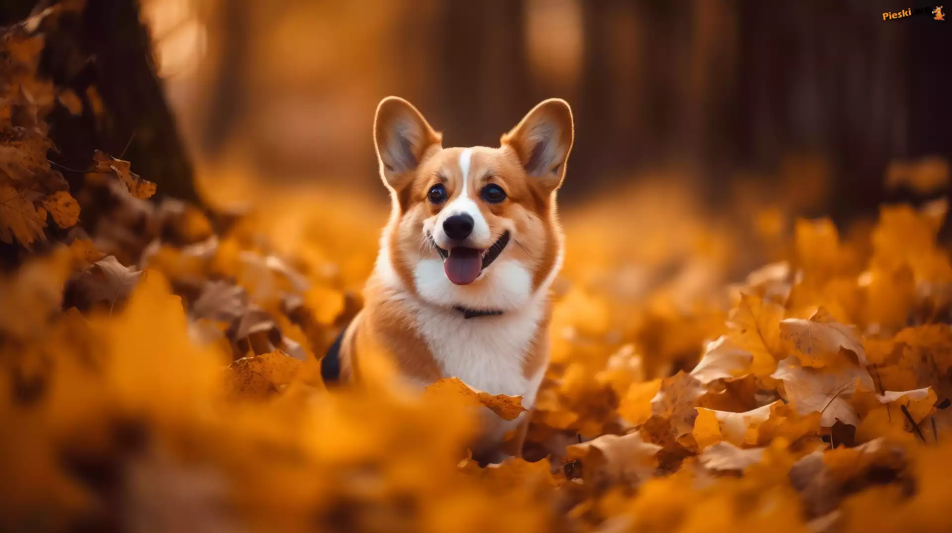 Liście, Grafika, Pies, Jesień, Welsh corgi pembroke, Pieski