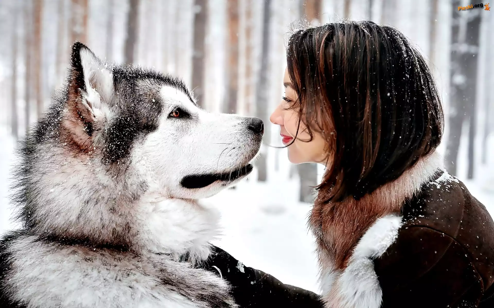 Kobieta, Pies, Husky, Śnieg, Pieski