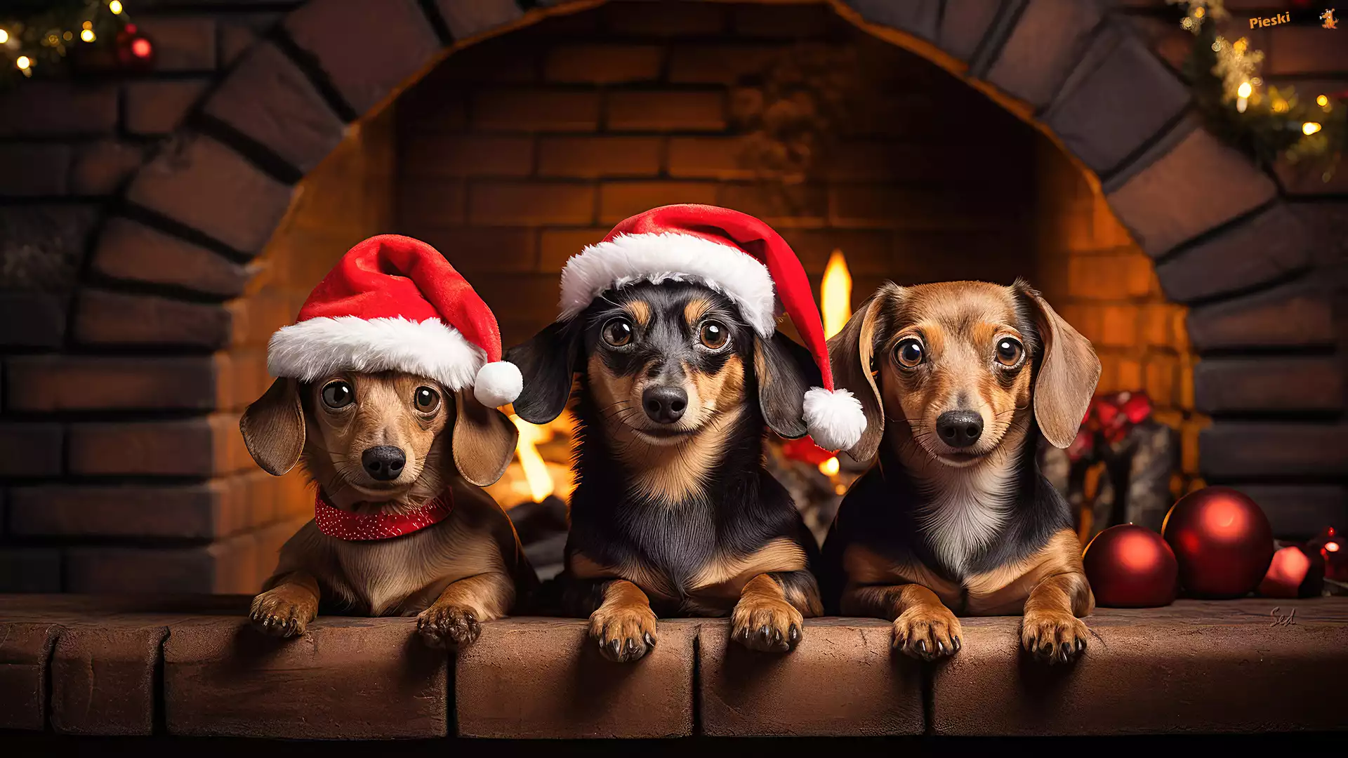Grafika, Trzy, Jamniki, Kominek, Psy, Czapki, Mikołaja