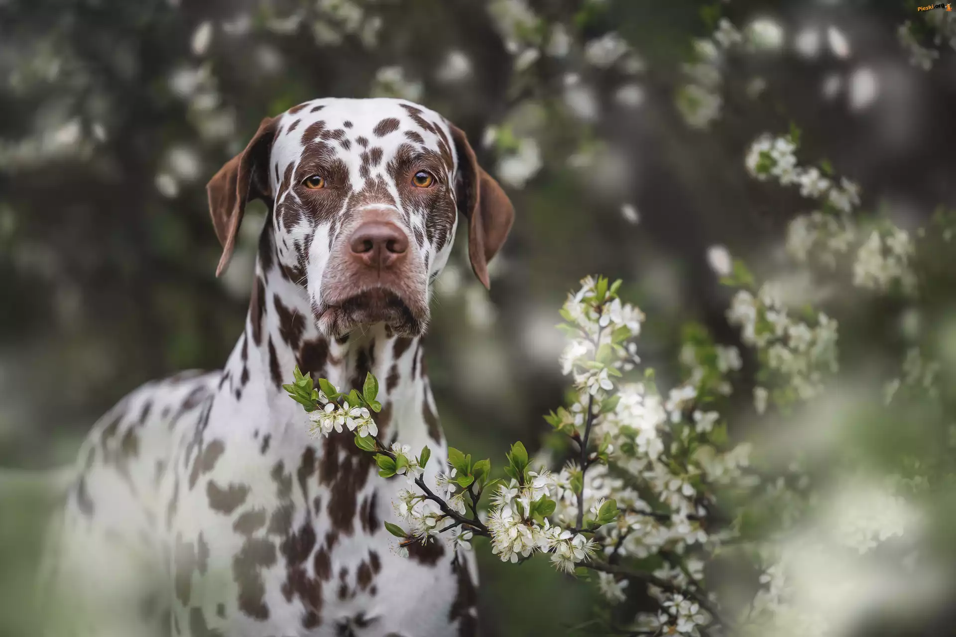 Gałązki, Kwiaty, Pies, Białe, Dalmatyńczyk