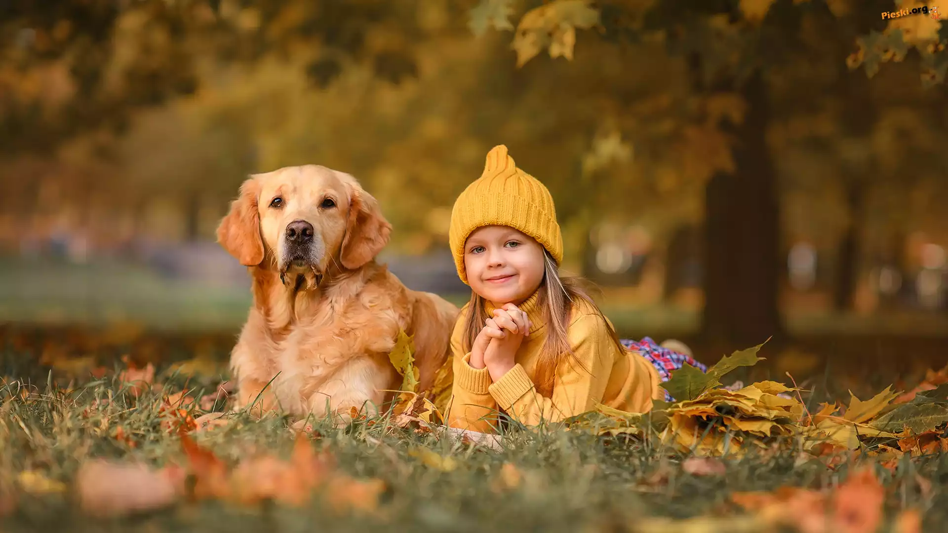 Liście, Czapka, Pies, Drzewo, Dziewczynka, Golden retriever, Łąka, Pieski