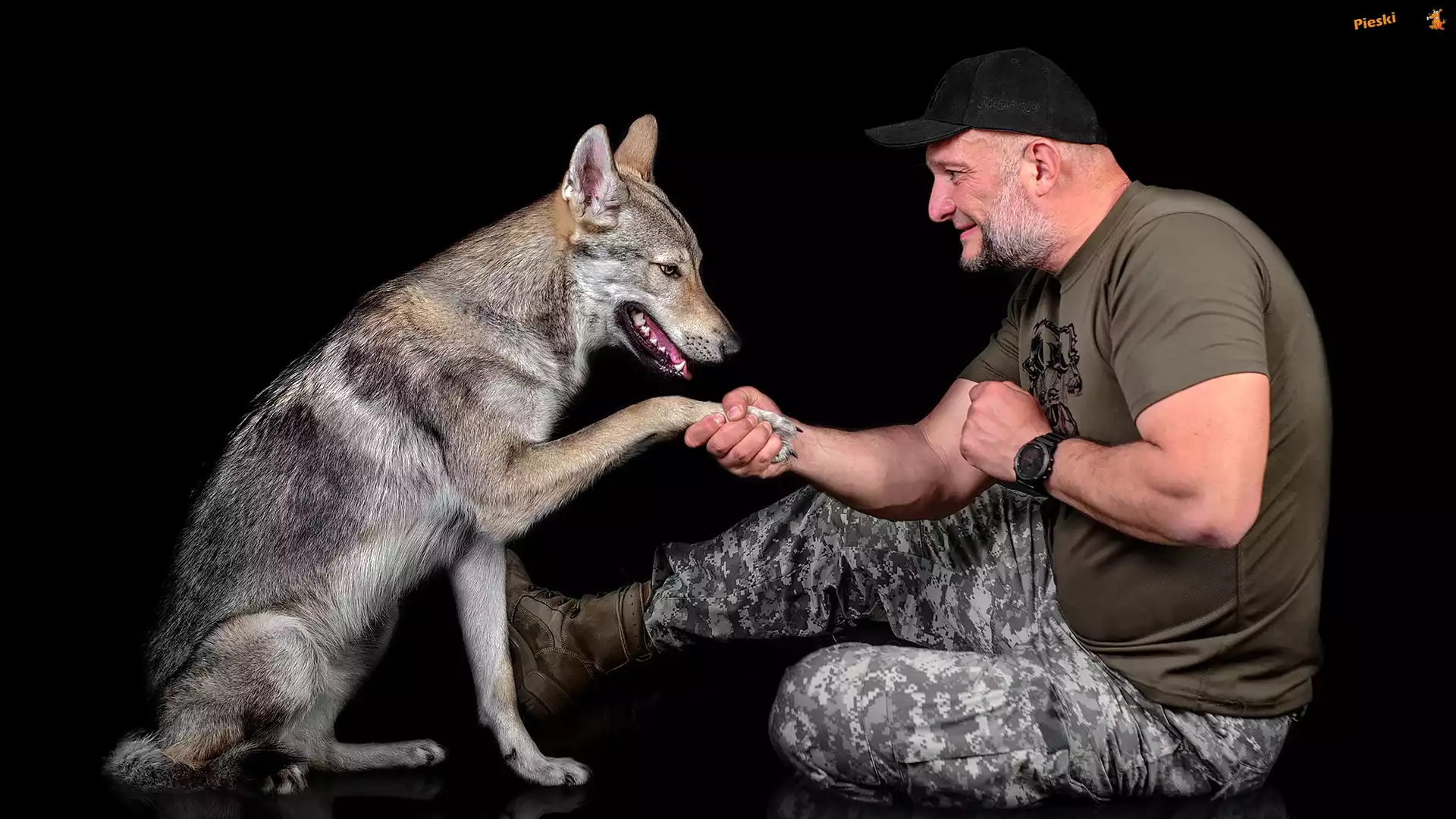 Pies, Mężczyzna, Wilczak czechosłowacki, Broda, Czapka, Zegarek, Łapa, Pieski