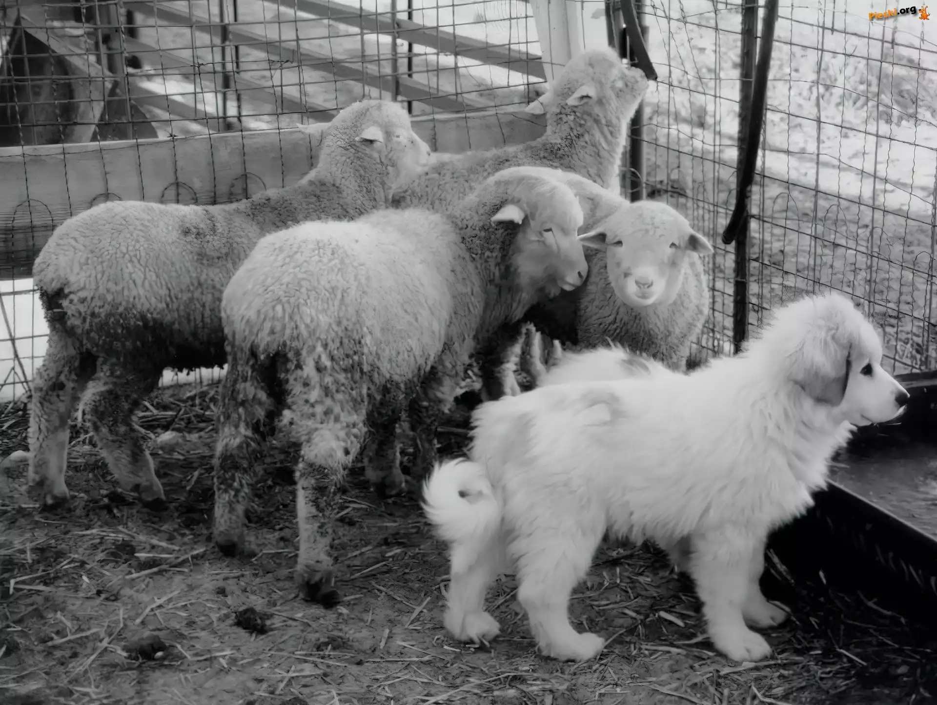 Młody, Owczarek węgierski Kuvasz, owce, Pieski
