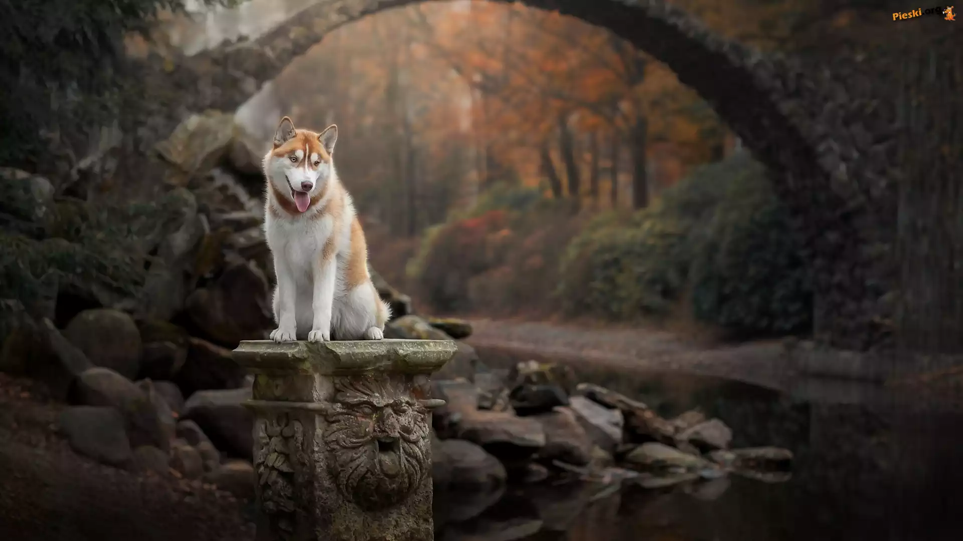 Pies, Mostek, Kamienie, Siberian husky, Postument, Potok