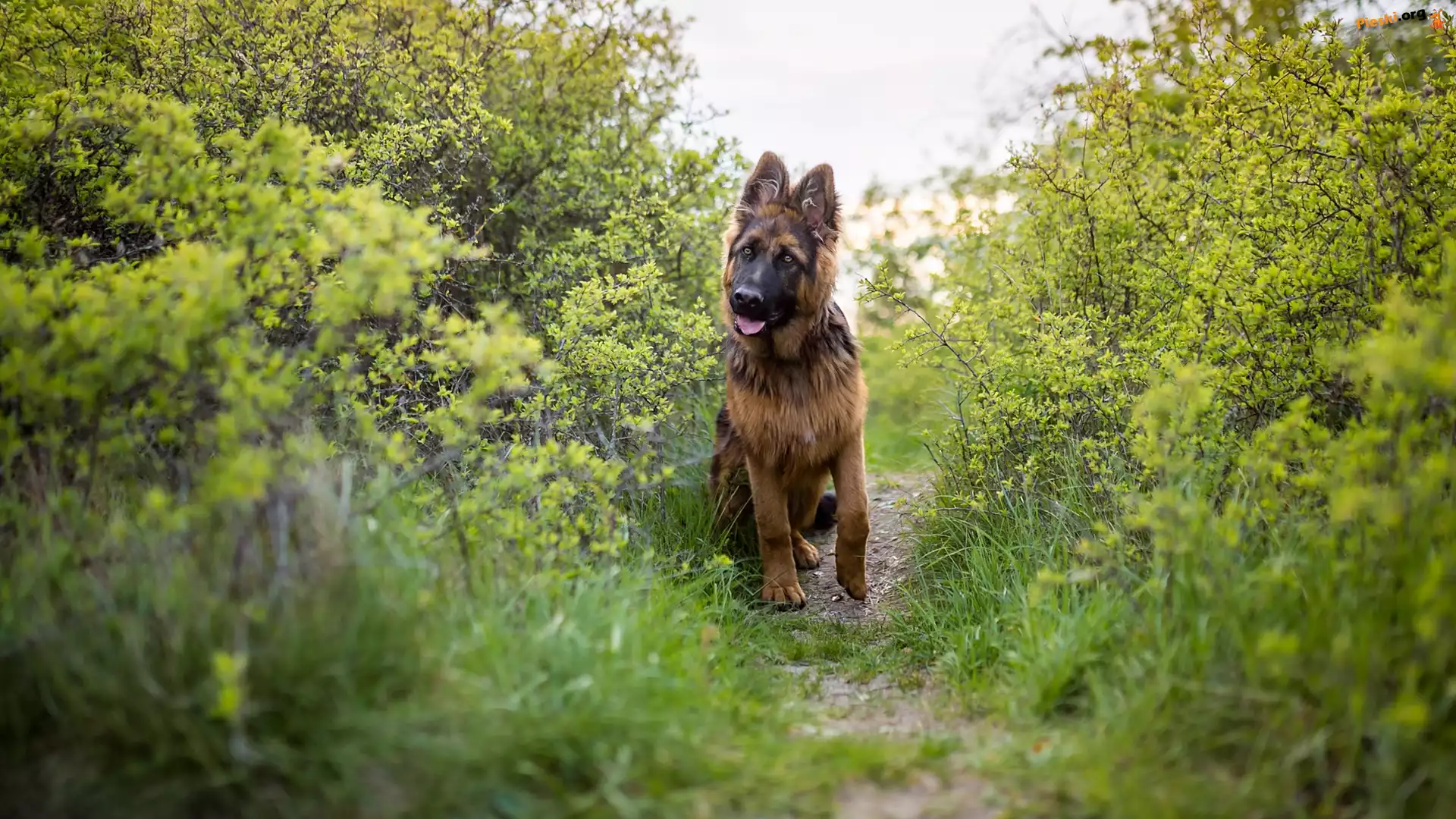 Ścieżka, Pies, Owczarek niemiecki, Krzewy, Pieski