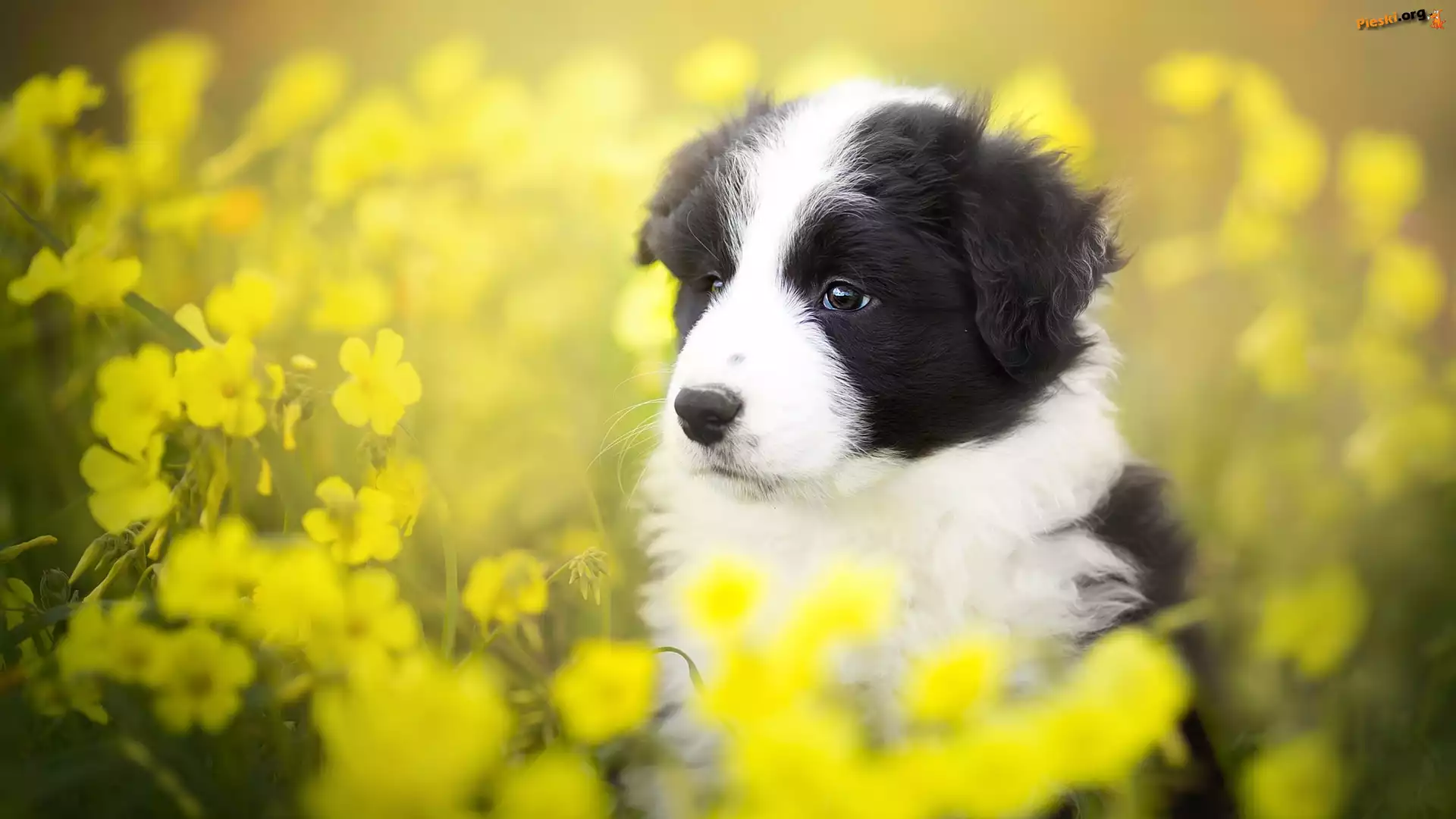 Żółte, Border collie, Szczeniak, Łąka, Kwiaty, Pieski