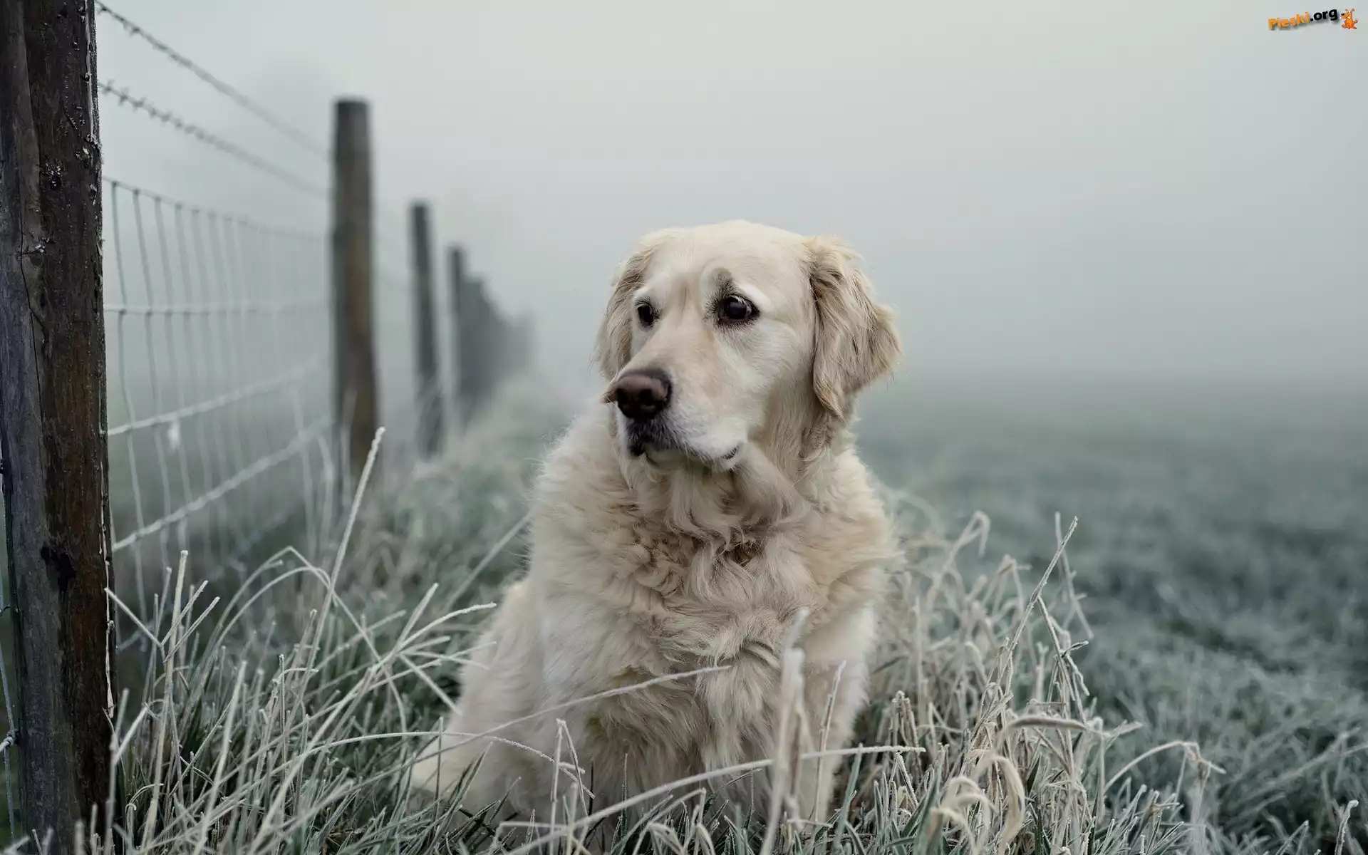 Oszroniona, Golden retriever, Płot, Trawa, Pieski