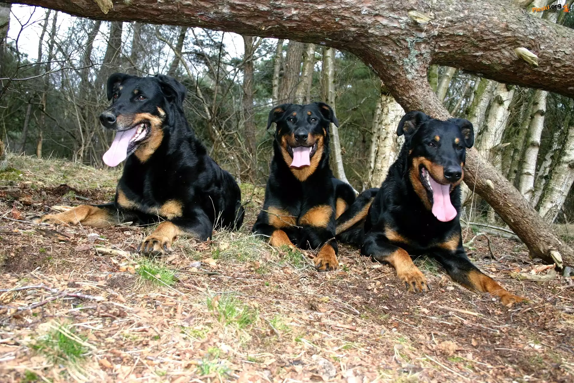 przewrócone, Trzy, Beaucerony, drzewo, Pieski