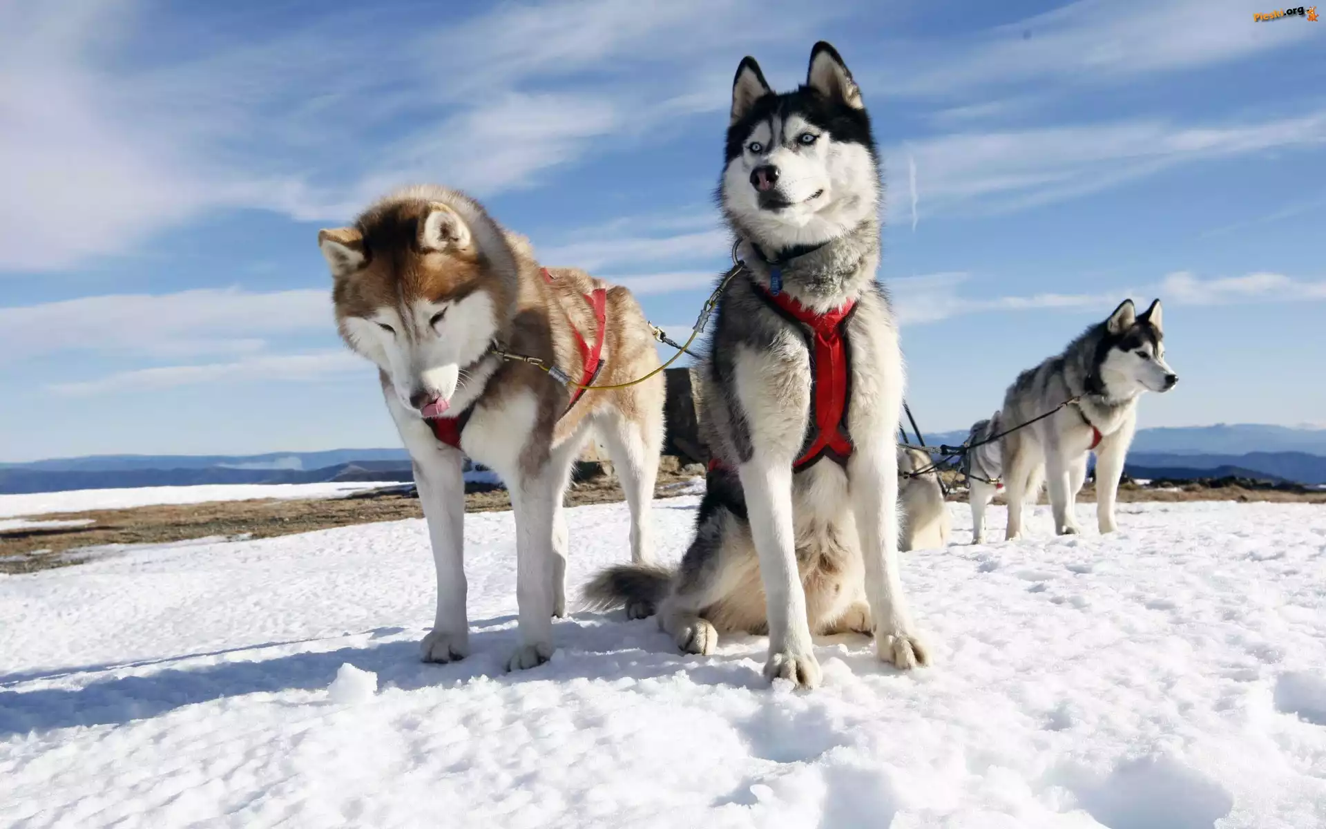 Psy, Góry, Sanie, Husky, Zaprzeg, Zima, Pieski