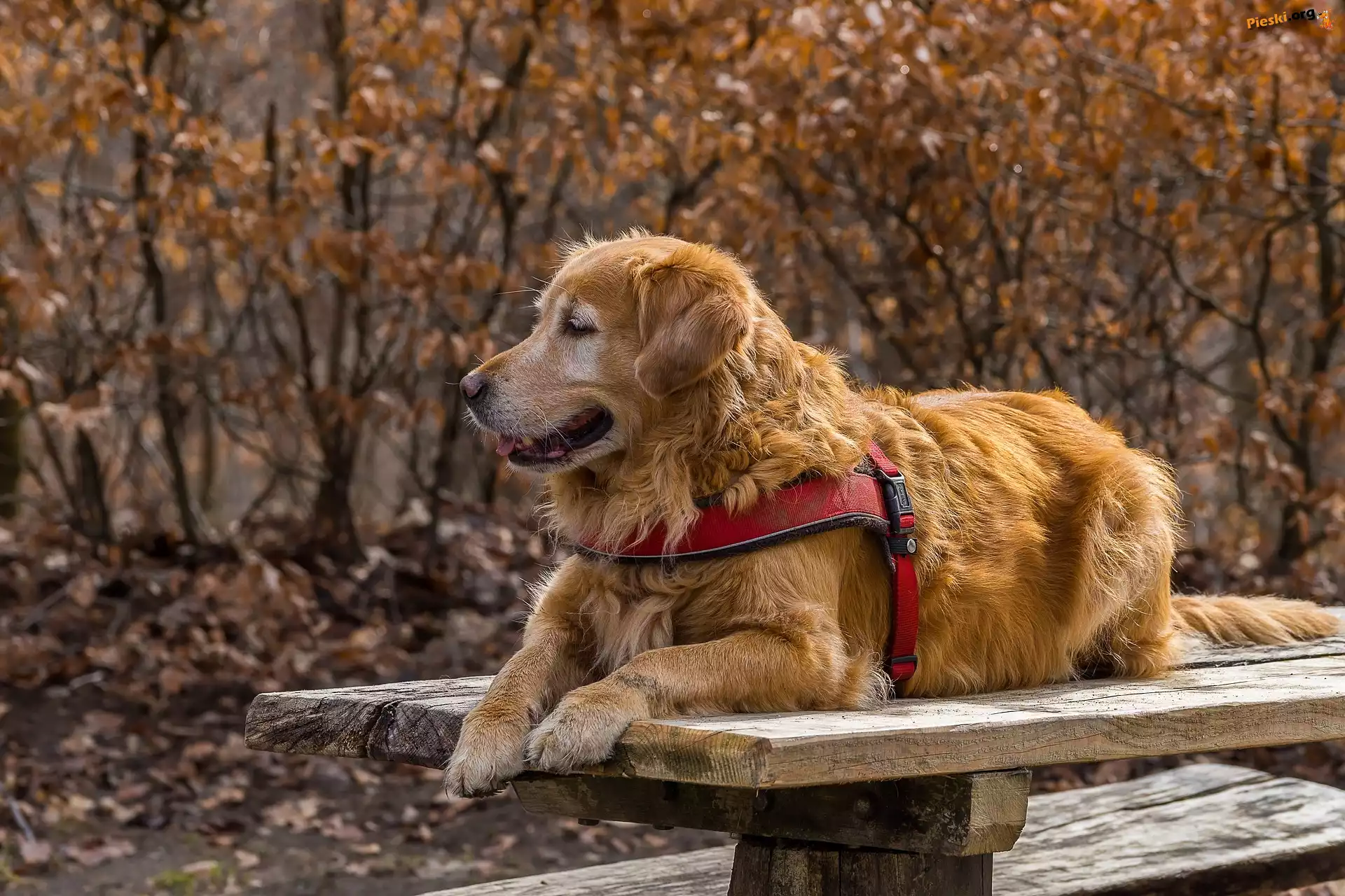 Ławka, Pies, Golden retriever, Szelki, Pieski