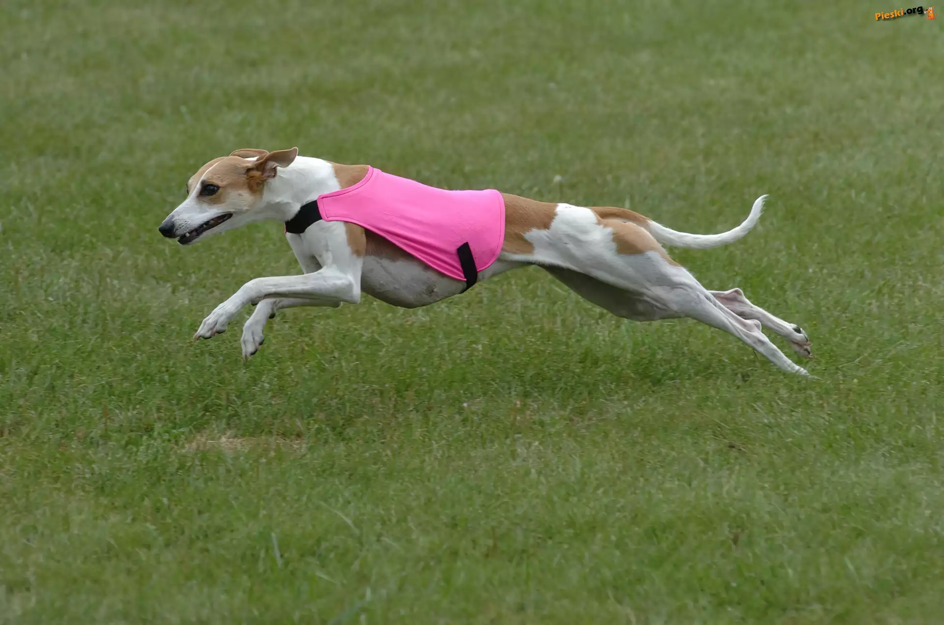 Whippet, zielona, trawa Mordka, Pies, Whippet, Liście Whippet, różowe, ubranko Pies, Whippet, Mordka