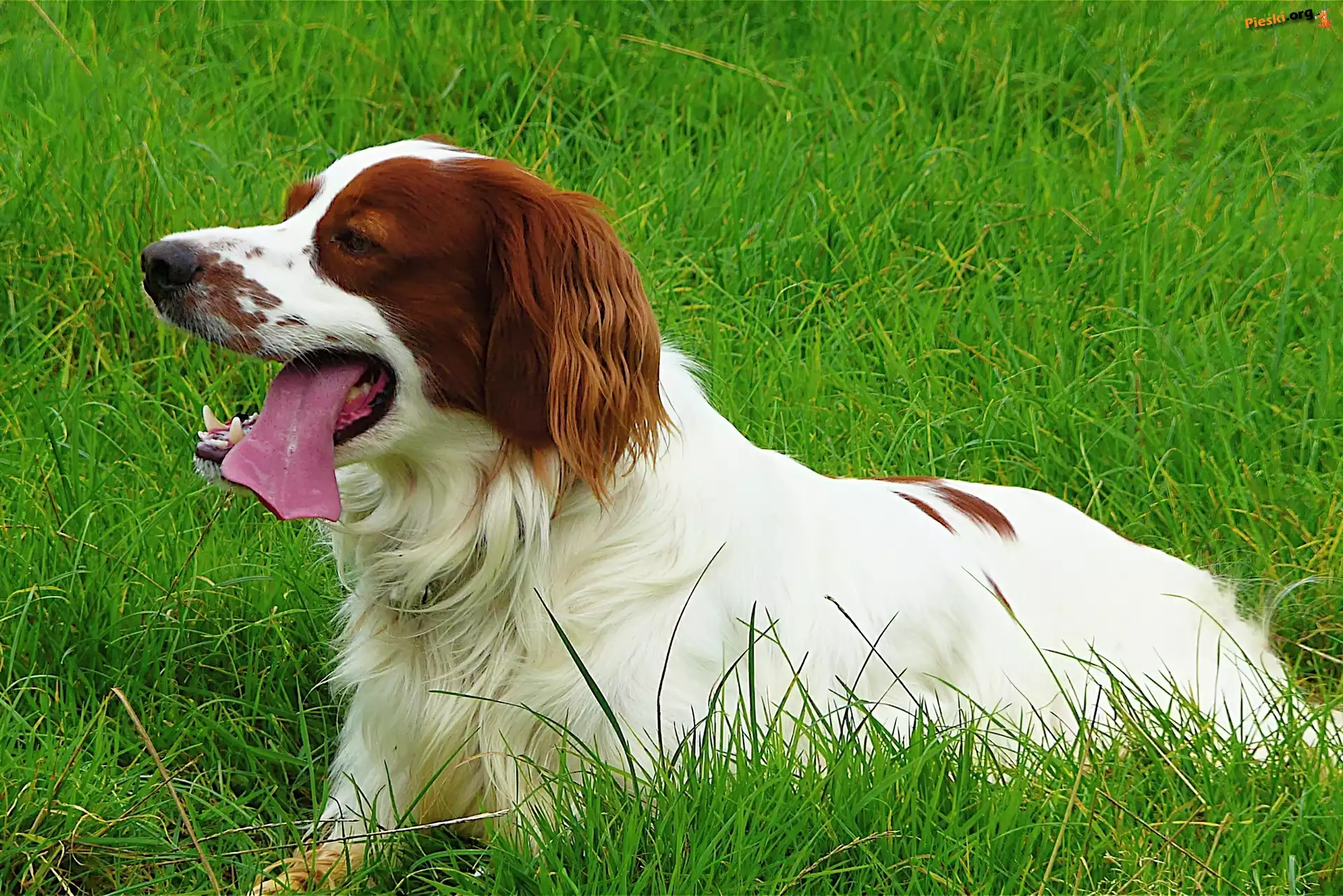 młoda, Seter irlandzki czerwono-biały, język, trawa