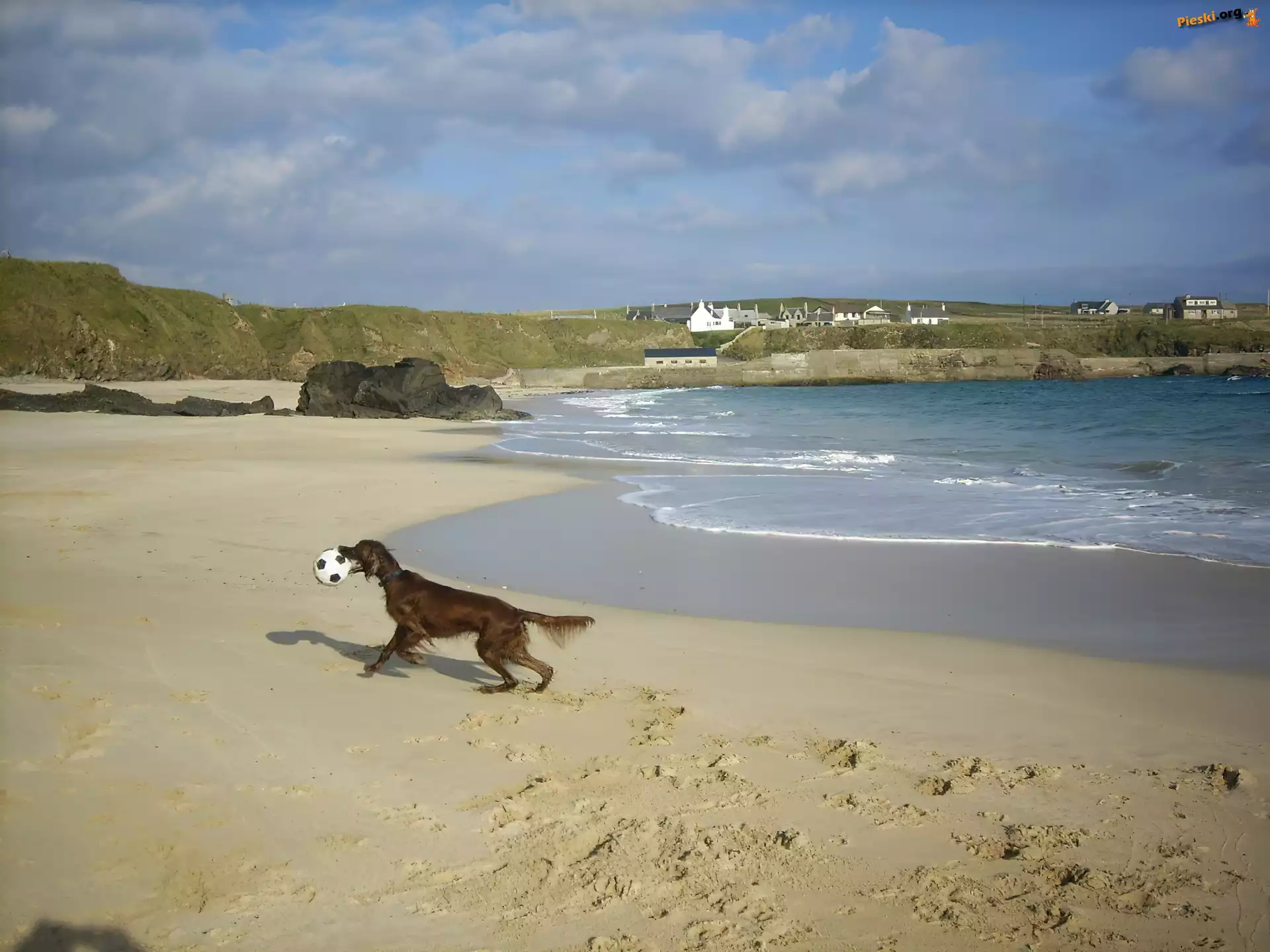 Seter irlandzki, plaża, piłka
