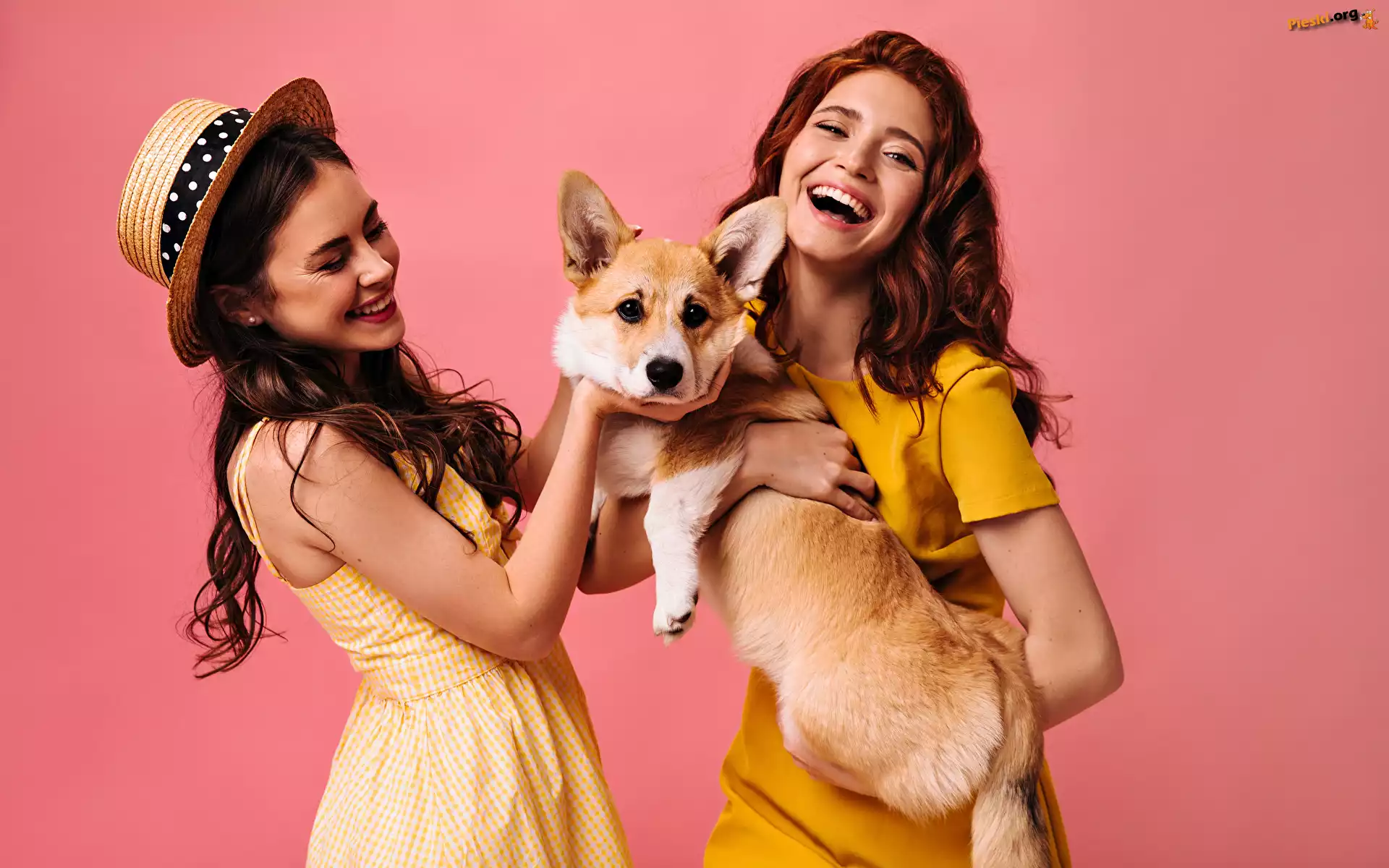 Welsh corgi pembroke, Młode, Kobiety, Pies, Dwie, Uśmiech, Kapelusz