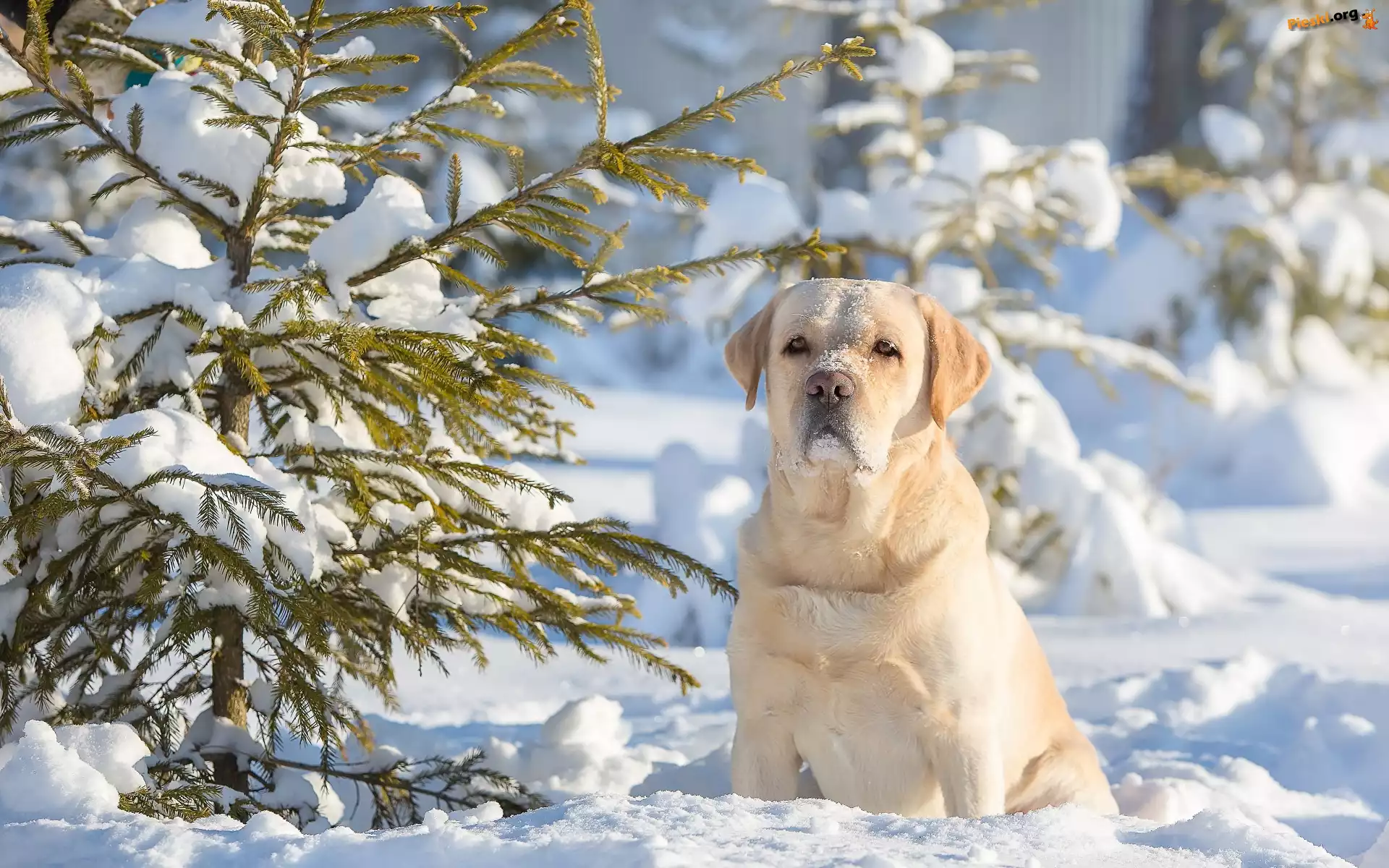 Zima, Retriever, Labrador, Śnieg, Iglaki