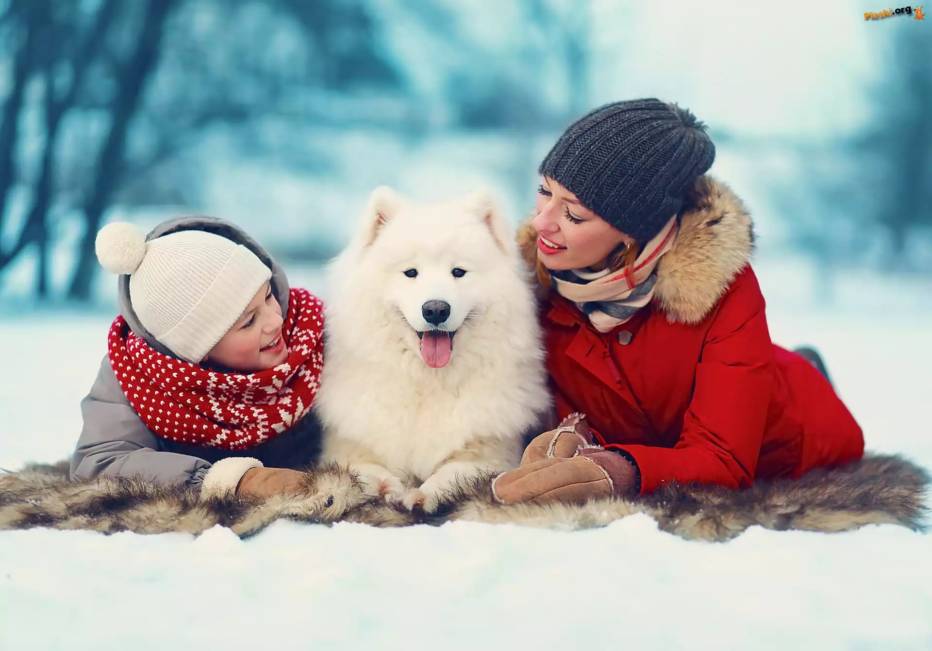 Zima, Dwie, Samojed, Biały, Pies, Kobiety